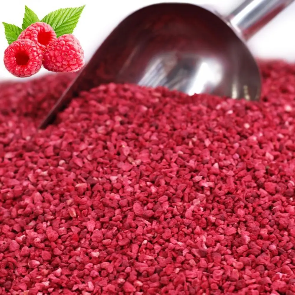 Сублимированные продукт благодаря технологическим особенностям обработки сохраняет в себе все качества свежего плода. Имеет насыщенный вкус, который доступен в любое время года. Сублимированные кусочки малины используется в качестве добавки и декора в кондитерских изделиях. Сублимированый продукт представляют собой нарезанные кубиком ягоды малины 3-5 мм. При перевозке часть кусочков малины могут пострадать при контакте друг с другом.